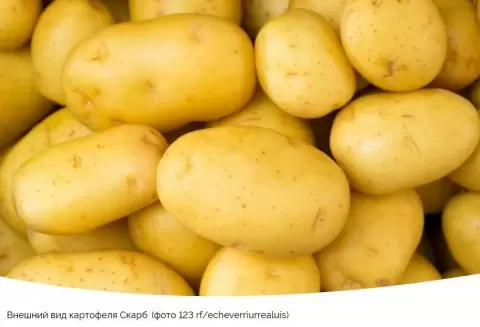 Сорт относится к среднепоздним, и его клубни достигают полной зрелости всего через 80–90 дней после появления первых ростков. Клубни Скарба поражают своими размерами: они крупные, овально-округлой формы с гладкой желтой кожурой и неглубокими глазками. Средний вес клубня варьируется от 100 до 138 граммов. Мякоть имеет приятный желтоватый оттенок, сделающую его излюбленным у кулинаров.
