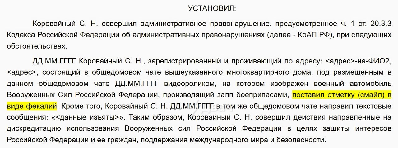 Мужчина оставил реакцию в виде «какашки» под видео с российской военной техникой, опубликованным в общем чате дома. Это было квалифицировано как дискредитация армии. Сам ростовчанин свою вину не признал. Он заявил, что таким образом выражал недовольство автору. Однако суд не принял эти доводы. Теперь мужчине предстоит выплатить административный штраф.