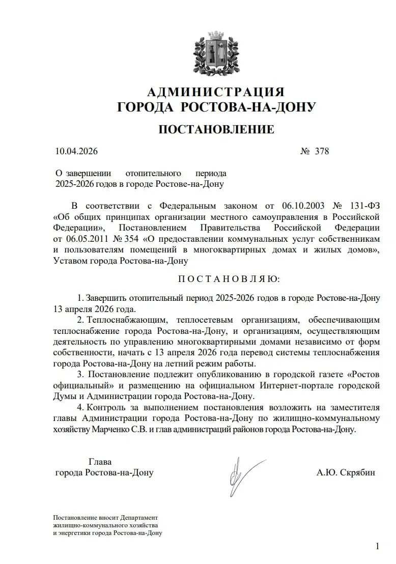 Отопительный сезон в Ростове заканчивается сегодня. Глава города Александр Скрябин подписал постановление. Ресурсные организации и управляющие компании переходят на летний режим работы - начинают подготовку к следующему сезону.
