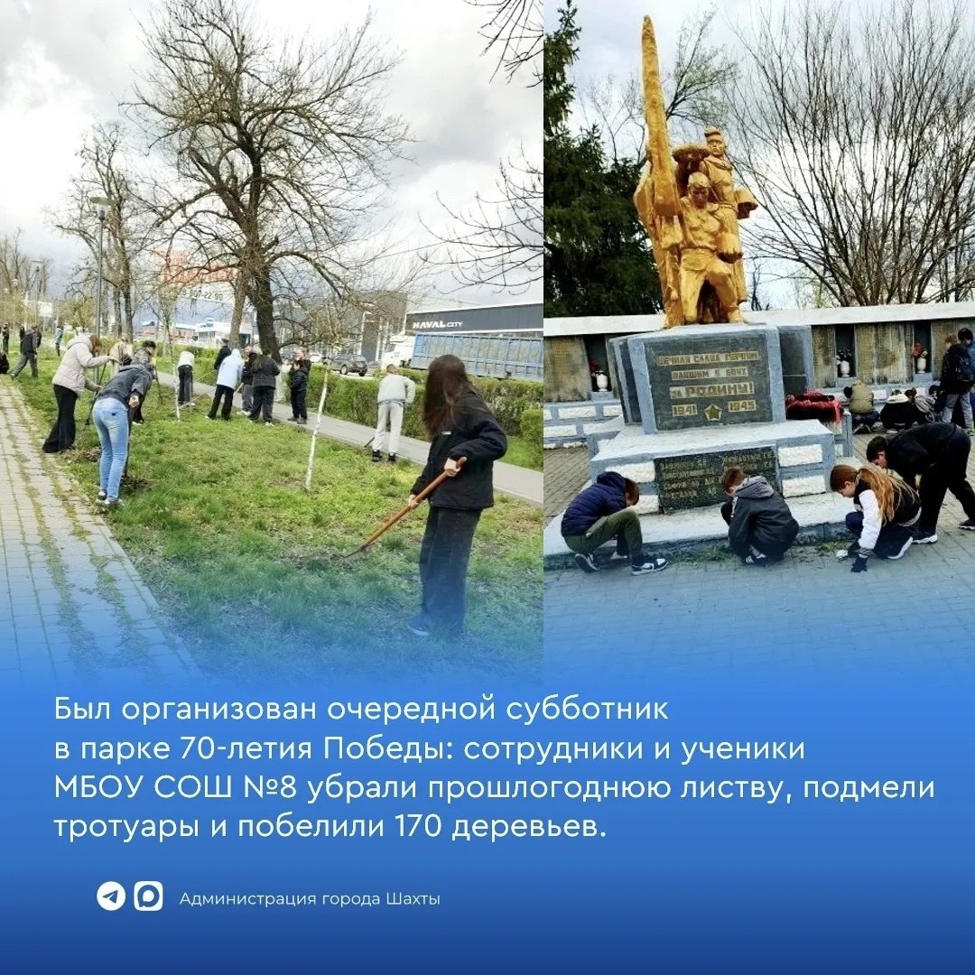 На этой неделе был организован очередной субботник в парке 70 лет Победы: сотрудники и ученики МБОУ СОШ №8 убрали прошлогоднюю листву, подмели тротуары и побелили 170 деревьев. Благодарность за участие выражаем директору школы Локтионовой Е.Ф. и всем неравнодушным жителям.