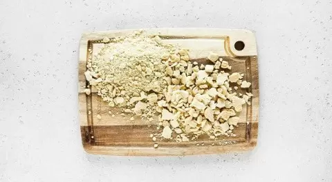 Первым делом, печенье нужно поломать на мелкие кусочки, а затем разделить его на две части. Половину печенья следует тщательно истолочь – это станет основой для «мясной» части колбасы. Мелкие кусочки – это «шпик», который придаст оригинальности десерту.
