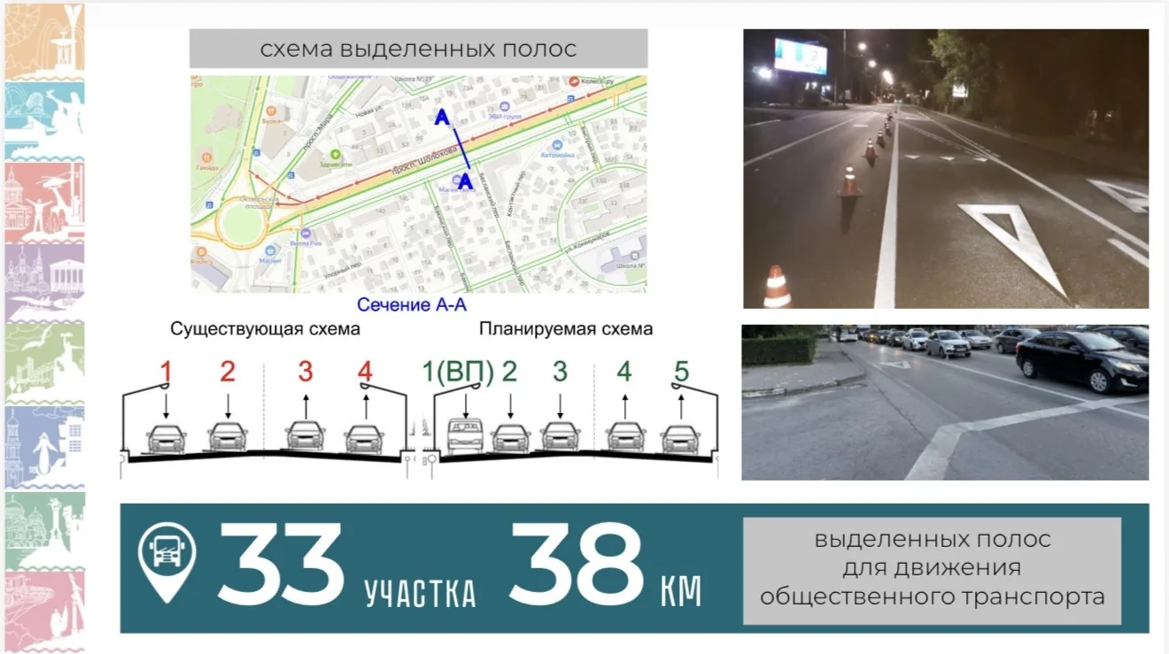На сегодняшний день в городе организовано 38 км выделенных полос для общественного транспорта. Они действуют на 33 участках ключевых магистралей, включая проспект Стачки, проспект Нагибина, улицу Стадионную, улицу Шеболдаева, проспект Ленина, проспект Будённовский, проспект Ворошиловский и другие.