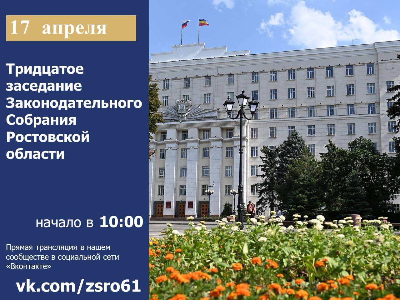 17 апреля состоится 30-е заседания Законодательного Собрания Ростовской области.