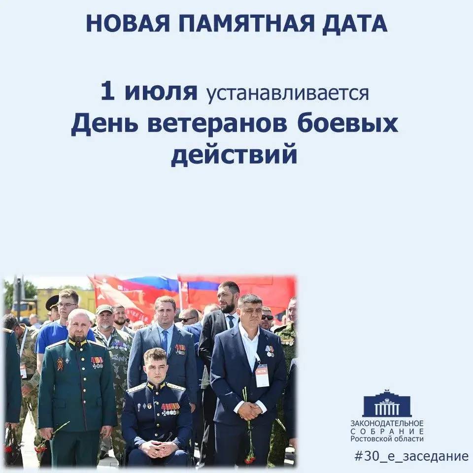 – В преддверии нашего главного государственного праздника Дня Победы принято очень важное решение. Мы должны культивировать уважительное отношение, прежде всего, среди нашей молодёжи, да и в целом в обществе к тем людям, кто отстаивает интересы Родины на фронтах сражений и в специальных операциях, которые проводят наши Вооруженные силы. Поэтому теперь День ветерана боевых действий будет официально отмечаться 1 июля. И уже в этом году в этот день мы скажем слова признательности и благодарности нашим воинам, которые живут в Ростовской области, – прокомментировал Председатель Законодательного Собрания Ростовской области Александр Ищенко.
