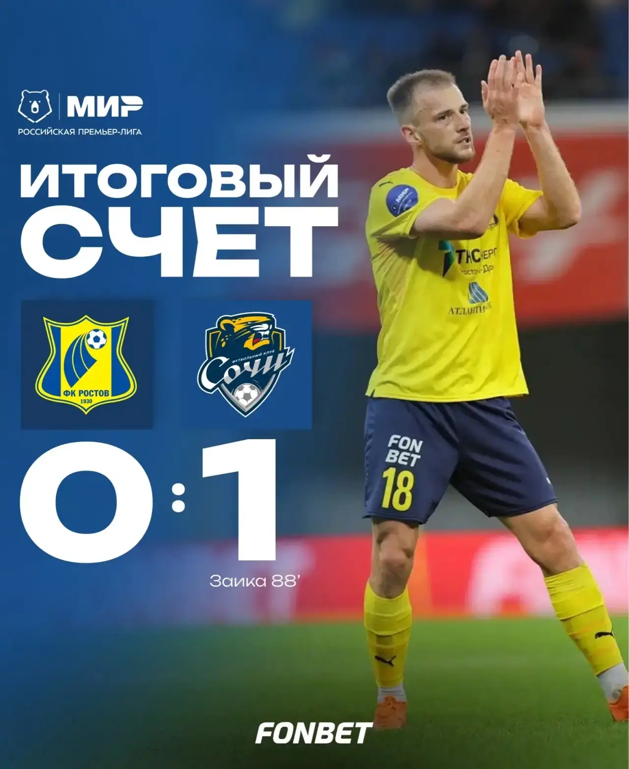 Матч 25го тура Российской премьерлиги между футбольным клубом «Ростов» с «Сочи» завершилась поражением жёлто-синих — сочинцы забили один гол.В первом тайме ворота обеих команд остались пустыми. Открыть счёт удалось уже во втором тайме, в самом его...