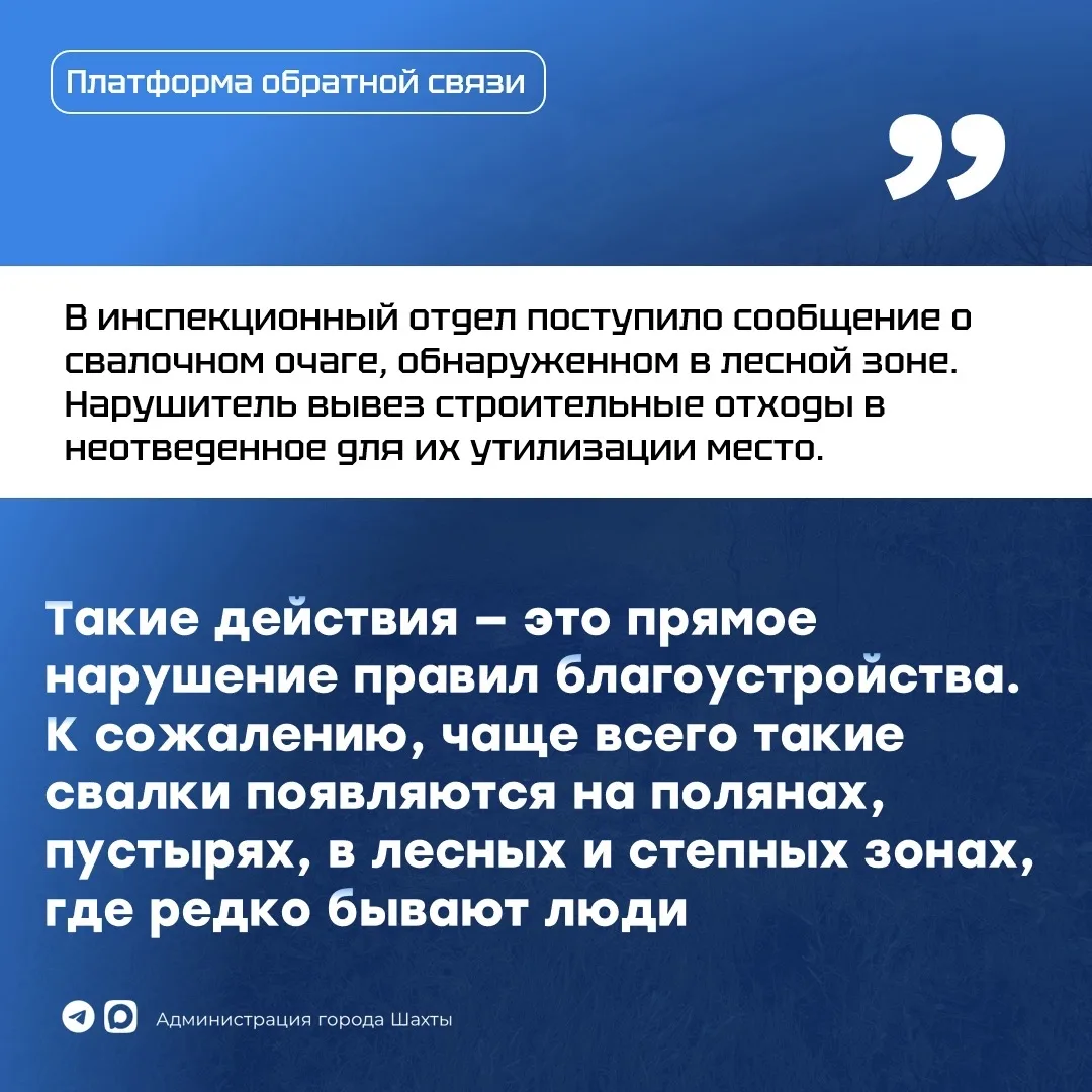На платформу обратной связи от жителей поступило сообщение с фиксацией образованного свалочного очага на территории садоводческого товарищества «Журавушка». Обращение было направлено в инспекционный отдел, где удалось оперативно установить личность нарушителя и обязать его вывезти мусор. В результате все строительные отходы были ликвидированы, а территория приведена в порядок.