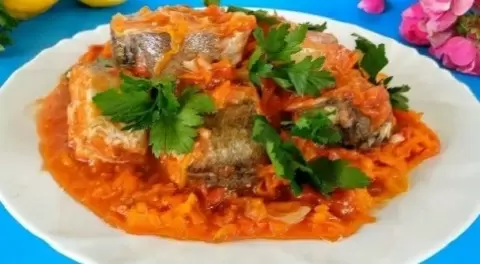 4. Дать настояться под крышкой 5–7 минут перед подачей. Хек в томате отлично сочетает с картофельным пюре, рисом или пастой, а также с хрустящим белым хлебом. Перед подачей щедро посыпать зеленью.