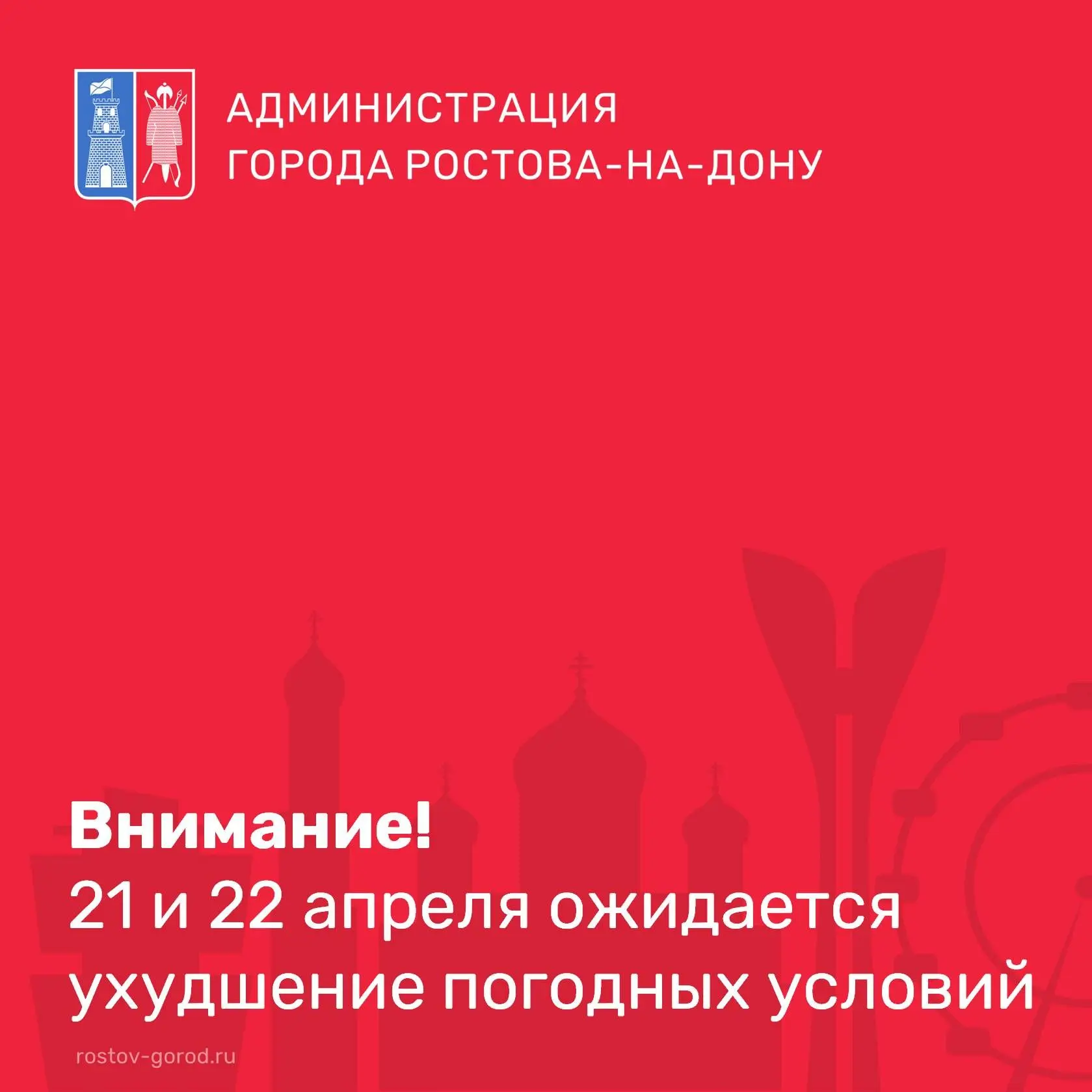 В соответствии со штормовым предупреждением Ростовского гидрометцентра в период с 18:00 до 20:00 и до конца суток 21 апреля, ночью и в первой половине дня 22 апреля местами в Ростовской области ожидается сильный дождь, ливень в сочетании с грозой, градом и сильным ветром 20-23 м/с.