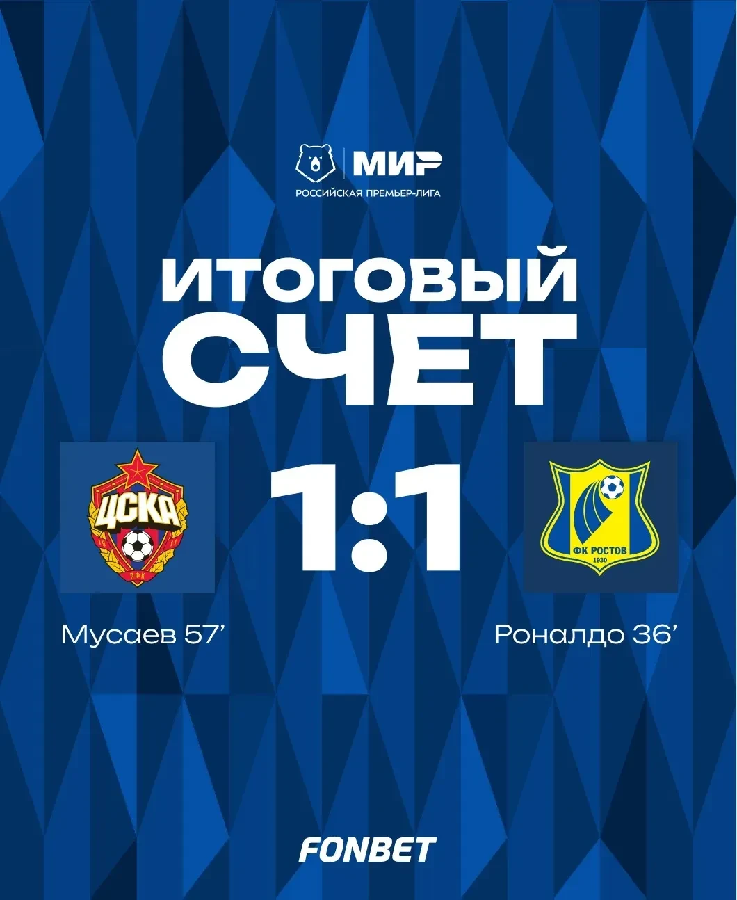 ЦСКА сыграл вничью с «Ростовом» со счетом 1:1 в домашнем матче 26-го тура Российской премьер-лиги (РПЛ).У хозяев отличился Тамерлан Мусаев (57-я минута). В составе гостей гол на счету Роналдо (36).ЦСКА не может выиграть третий матч подряд в РПЛ. Ранее...