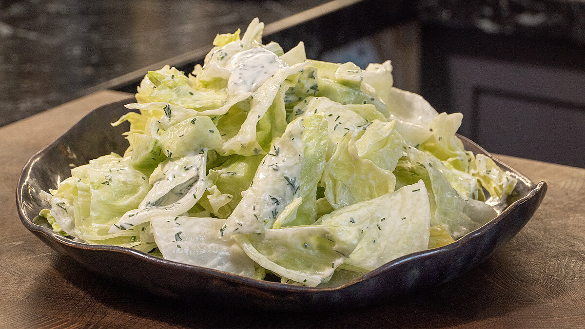 Для начала огурец следует очистить от кожицы и нарезать на небольшие кусочки. Затем в отдельной миске греческий йогурт смешивают с мелко нарезанным укропом, добавляют растительное масло и по вкусу солят. Далее листья салата айсберг рвут на крупные куски и помещают в миску с огурцами. Все ингредиенты аккуратно заправляют ароматным укропным йогуртом и перемешивают до однородности. Завершающим штрихом станет посыпка жареным хрустящим луком, добавляющим текстуру и вкус.