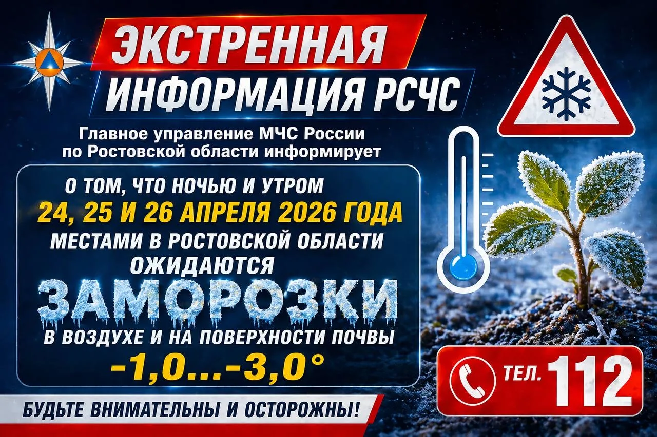 Ночью и утром 24, 25 и 26 апреля 2026 года местами в Ростовской области ожидаются заморозки в воздухе и на поверхности почвы -1,0...-3,0°.