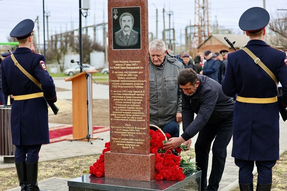 Мемориальную плиту в память о майоре милиции открыли в Морозовске. Торжественная церемония прошла в честь Владимира Орлова, погибшего при выполнении долга в августе 2001.