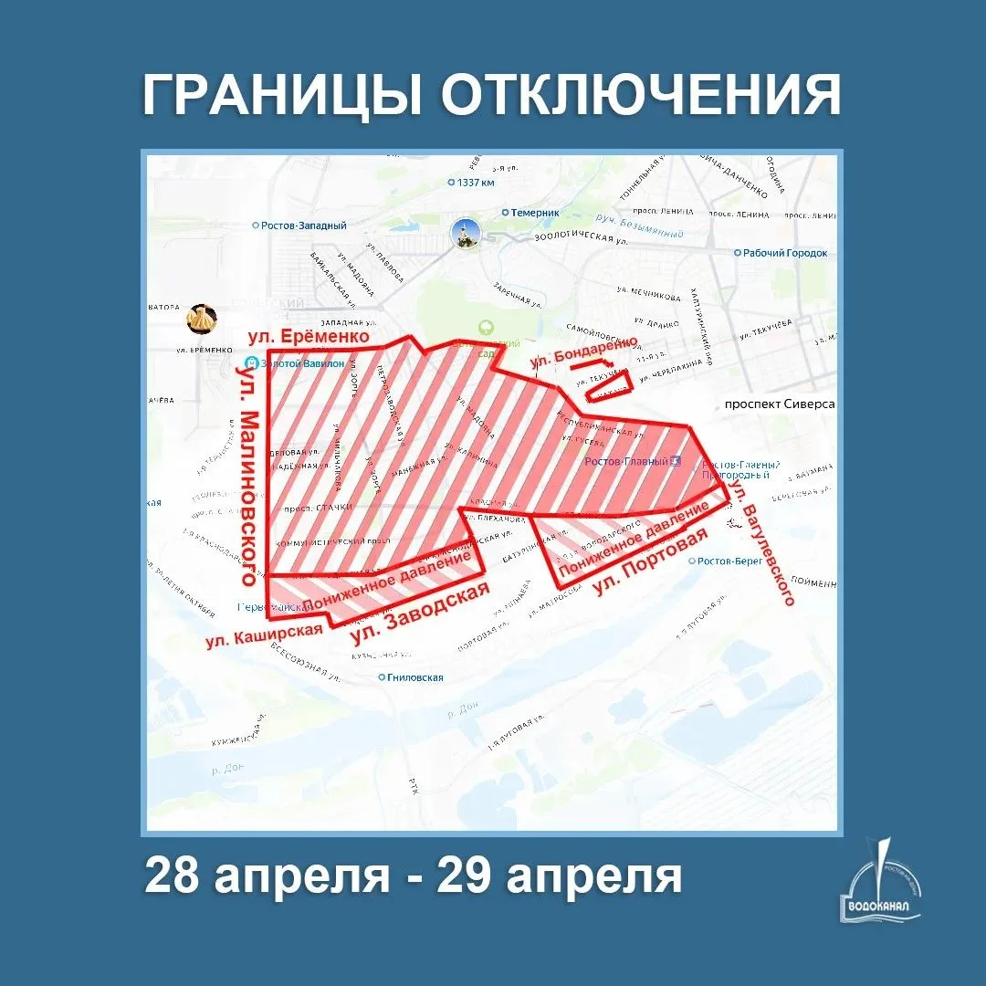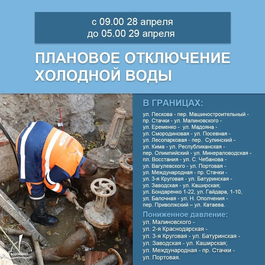 Воду отключат завтра в 9 утра, а снова пустят через сутки - в 05:00 среды. Границы отключения - Малиновского - Еременко - Мадояна - Каширская - Заводская - Портовая. Где-то вода будет, но с пониженным давлением.