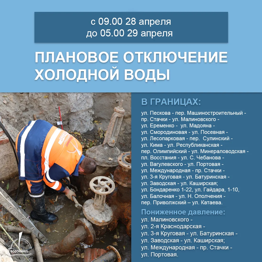 Просим запастись водой. ВНИМАНИЕ Перенос плановых работ с 22-23 апреля на 28-29 апреля Специалисты будут производить ремонтные работы на ВНС «Западная»