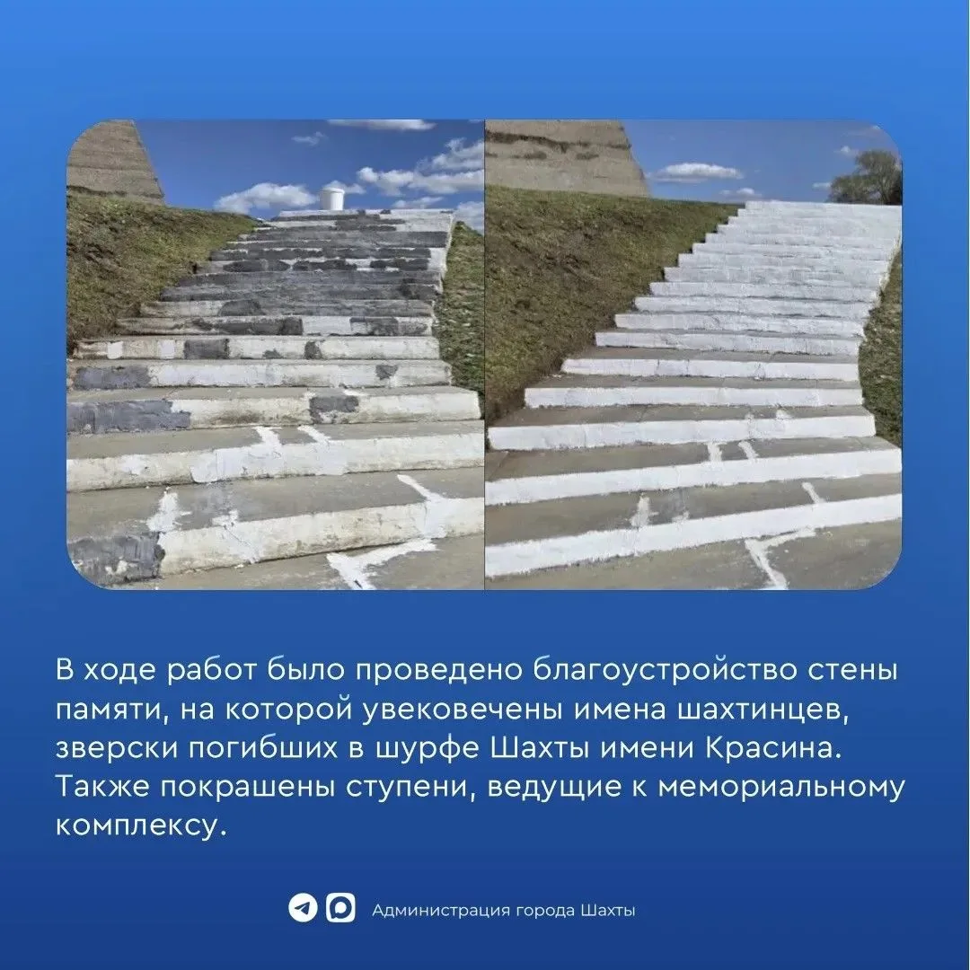 В ходе работ было проведено благоустройство стены памяти, на которой увековечены имена погибших в шурфе шахты, покрашены ступени, ведущие к мемориальному комплексу, убрана поросль и случайный мусор на прилегающей территории. Приведен в порядок сам монумент — памятник, на котором солдат держит вечный огонь.
