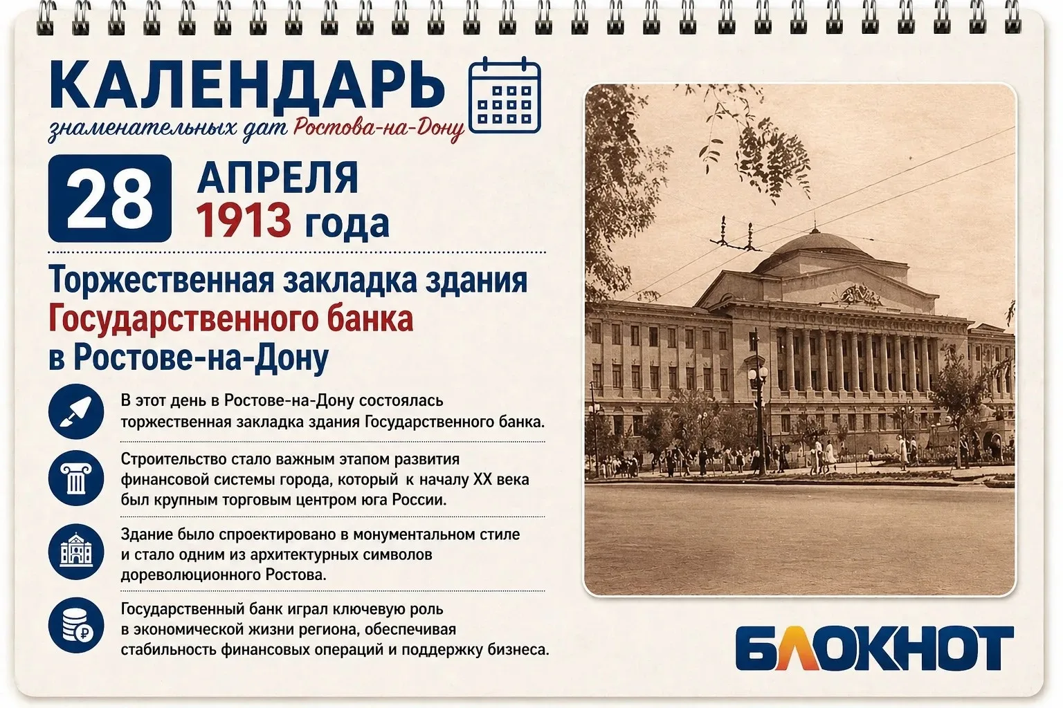 28 апреля 1913 год: В этот день в 1913 года произошла закладка здания Государственного банка. Торжественная церемония стала важным этапом в развитии финансовой системы города, который в начале XX века был крупным торговым центром Южного региона России.