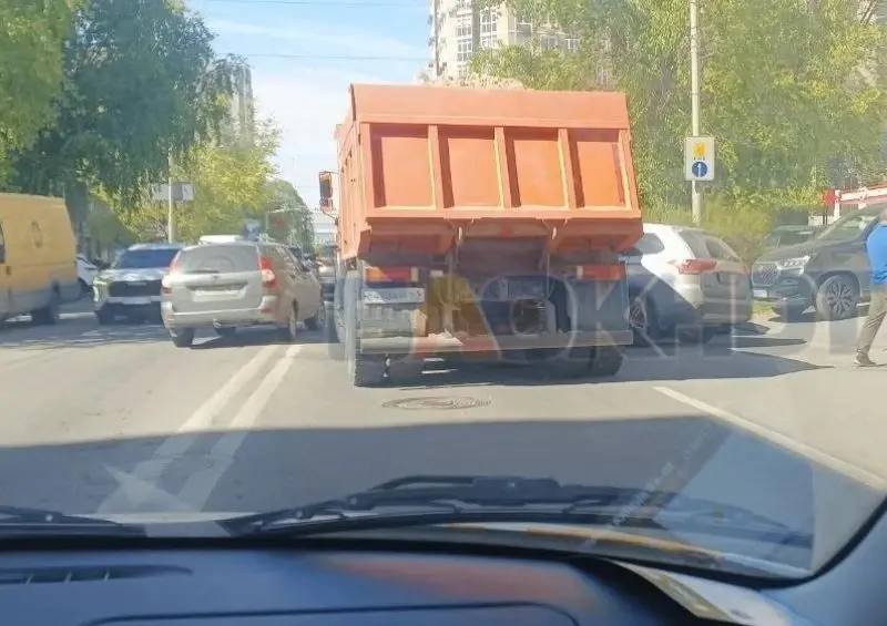 Груженый песком грузовик столкнулся с легковым автомобилем. На месте аварии образовалась серьезная пробка.