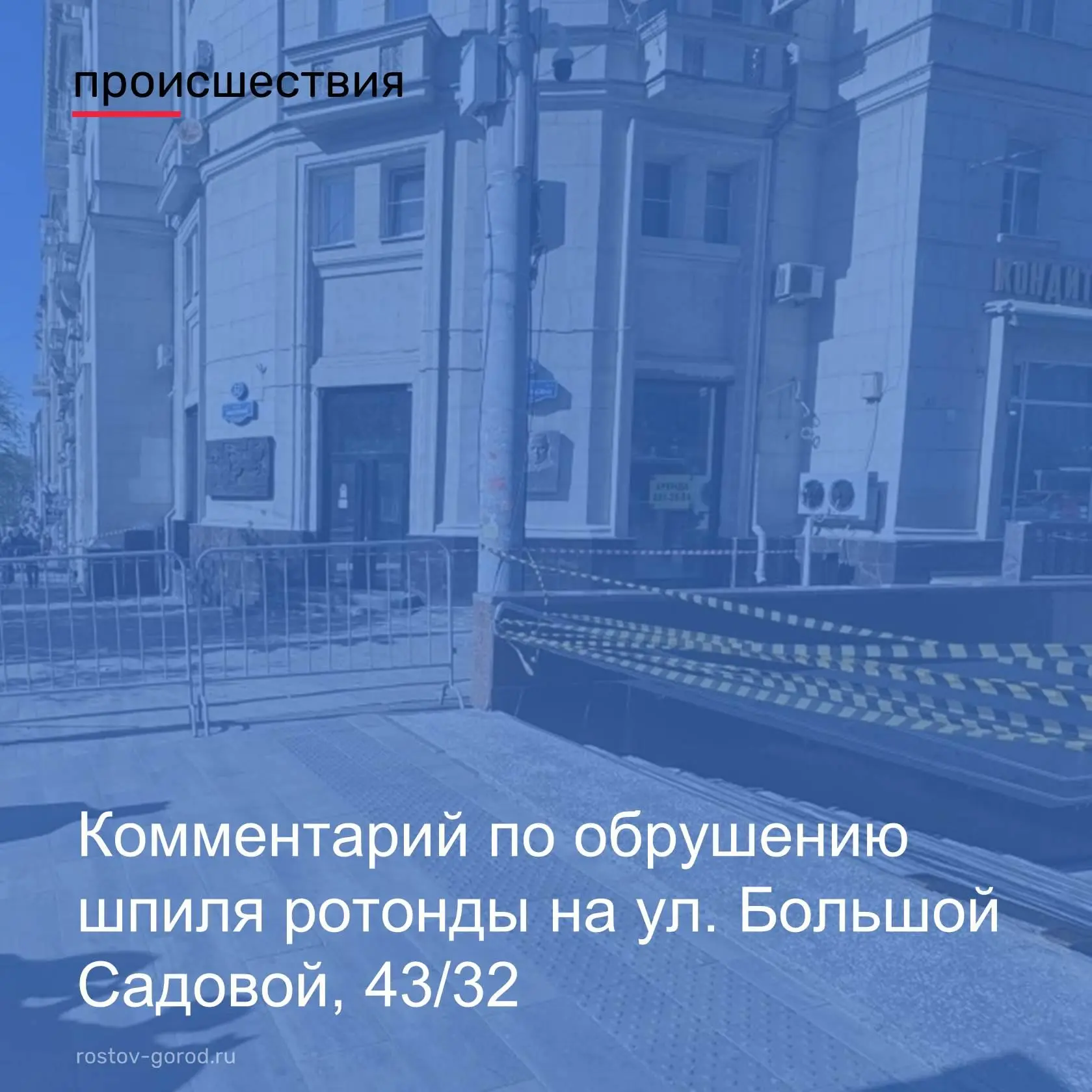 Сегодня произошло обрушение шпиля ротонды, расположенной на крыше МКД по адресу: ул. Большая Садовая, 43/32.