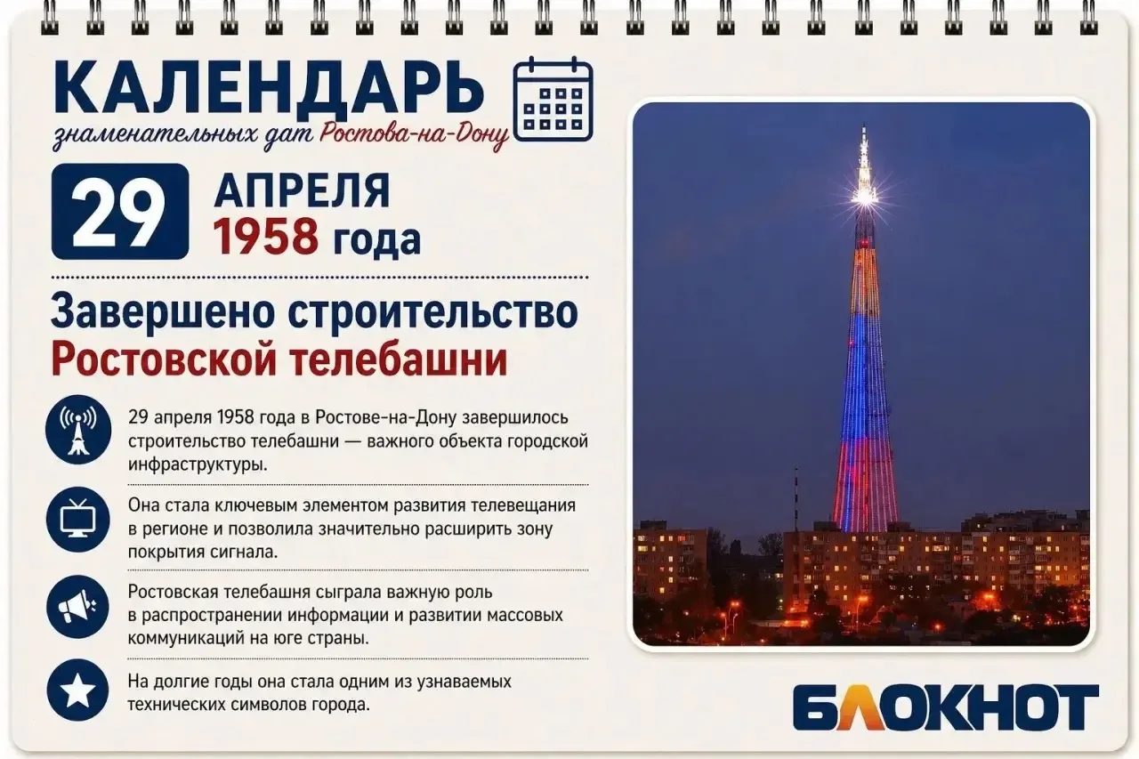 29 апреля 1958 года в Ростове: в этот завершилось строительство телебашни. Это один из важных объектов городской инфраструктуры.