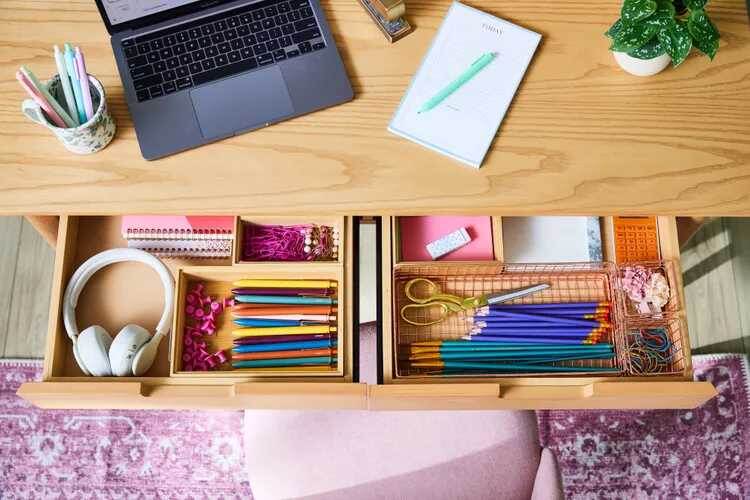 - Чистота в ящиках и на поверхности. На этапе подготовки важно приобрести необходимые органайзеры и лотки для канцелярии. Это поможет не только расставить всё по местам, но и добавить стиль вашему рабочему месту.