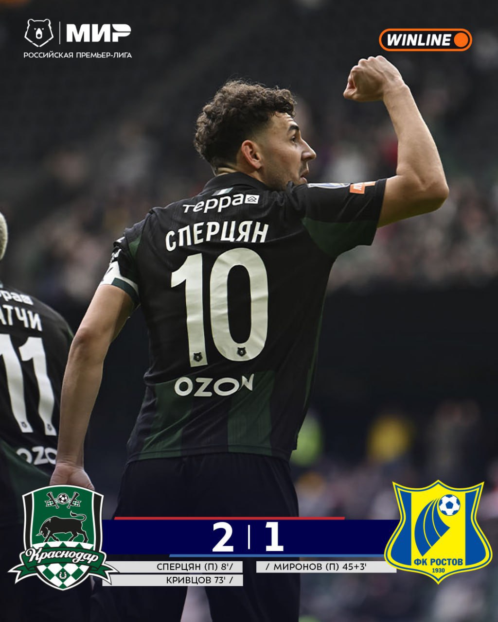 «Краснодар» набрал 43 очка и вернулся на первое место в турнирной таблице РПЛ. На второй строчке «Зенит» (42), «Ростов» расположился на 11-м месте (21).