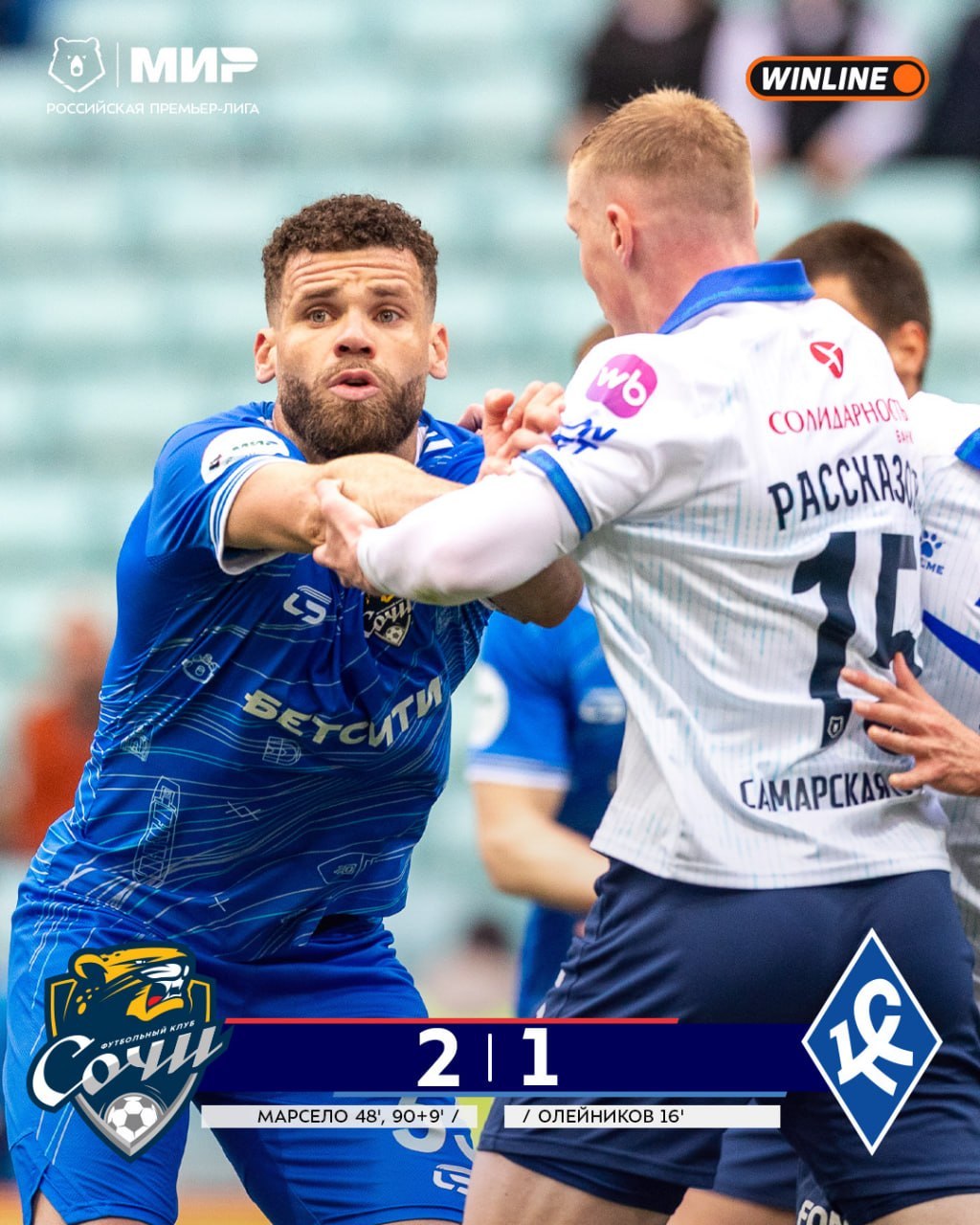 Футболисты «Сочи» обыграли самарские «Крылья Советов» со счетом 2:1 в домашнем матче 26-го тура Российской премьер-лиги (РПЛ).
